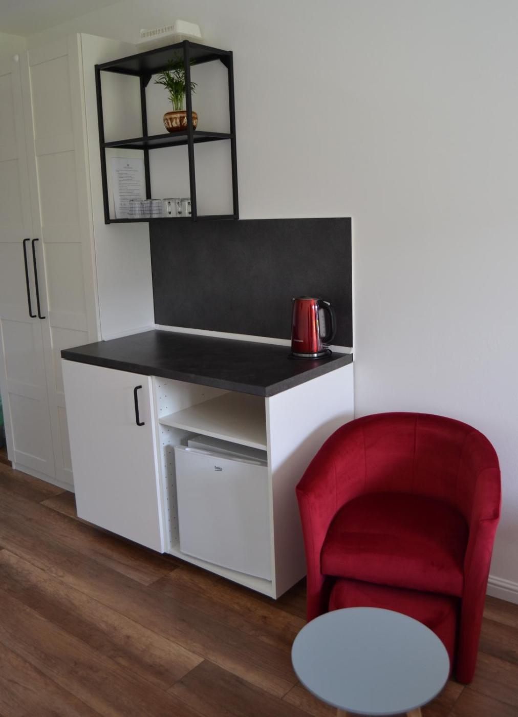 Wyposażenie obejmuje również lodówkę i czajnik.