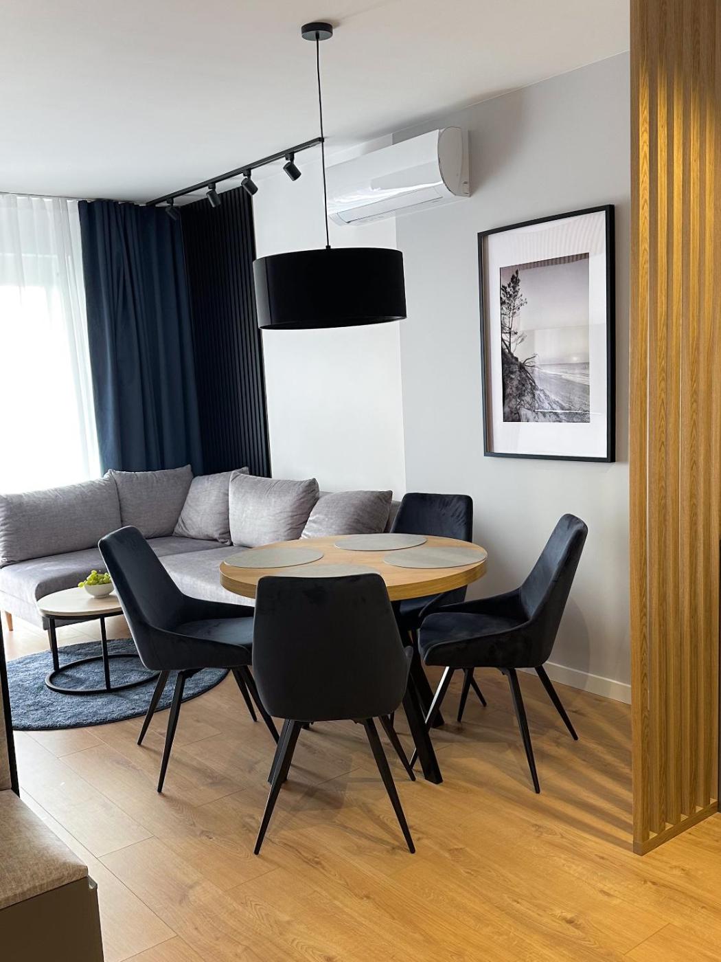 Oferta apartamentu obejmuje sypialnię (1), salon, kuchnię z pełnym wyposażeniem, w tym lodówką i ekspresem do kawy, a także łazienkę (1) z prysznicem oraz suszarką do włosów. W apartamencie zapewniono ręczniki i pościel.