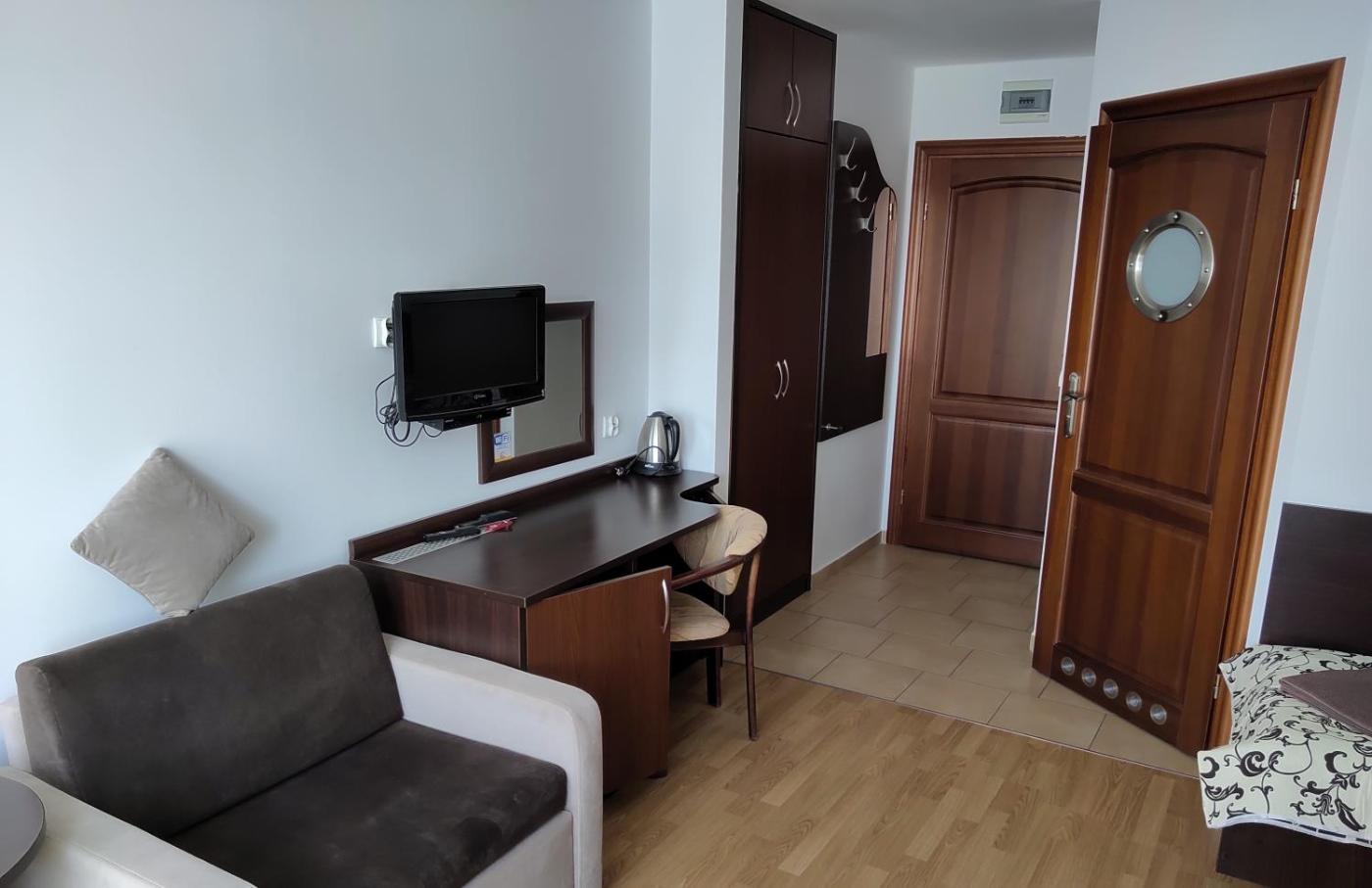 Pokój dwuosobowy. Ten klasycznie urządzony pokój wyposażony jest w telewizor z płaskim ekranem, lodówkę i czajnik elektryczny. Łóżka można ze sobą złączyć. Pokój Dwuosobowy - 2 osobowy. Powierzchnia pokoju ok.: 16 mkw. ;