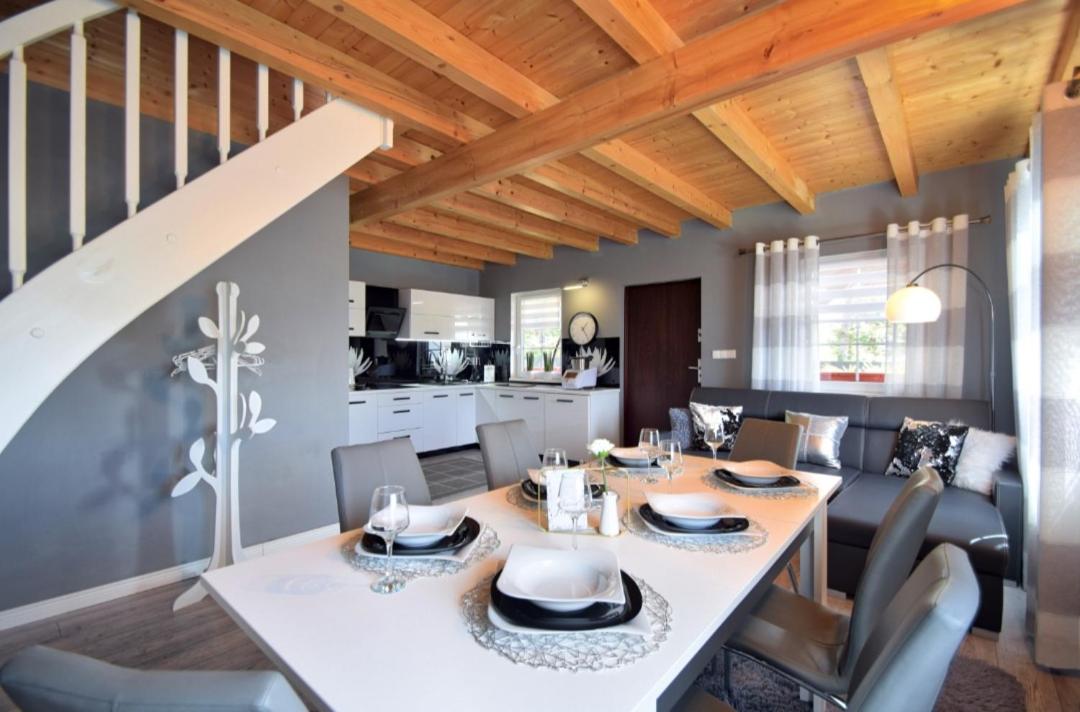 Dom z 2 sypialniami. This holiday homes special features are the hot tub and the sauna. Guests will find a stovetop, a refrigerator, a dishwasher and kitchenware in the well-equipped kitchen. The holiday home also comes with a barbecue. The unit has a washing machine, garden views, a terrace and winechampagne is available for guests. The unit has 5 beds. Dom wakacyjny - 7 osobowy. Powierzchnia pokoju ok.: 75 mkw.