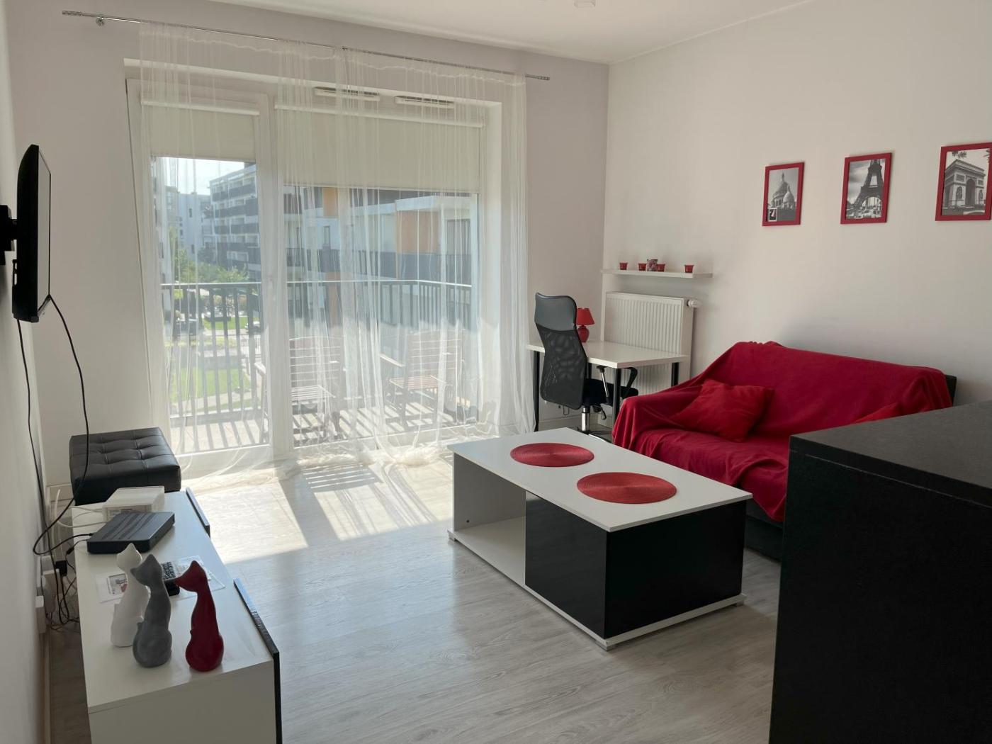 Apartament z 1 sypialnią. This apartment includes 1 living room, 1 separate bedroom and 1 bathroom with a shower and free toiletries. In the well-equipped kitchenette, guests will find a stovetop, a refrigerator, a dishwasher and kitchenware. The apartment offers a flat-screen TV, a washing machine, soundproof walls, a tea and coffee maker as well as garden views. The unit has 2 beds. Apartament - 3 osobowy. Powierzchnia pokoju ok.: 42 mkw.
