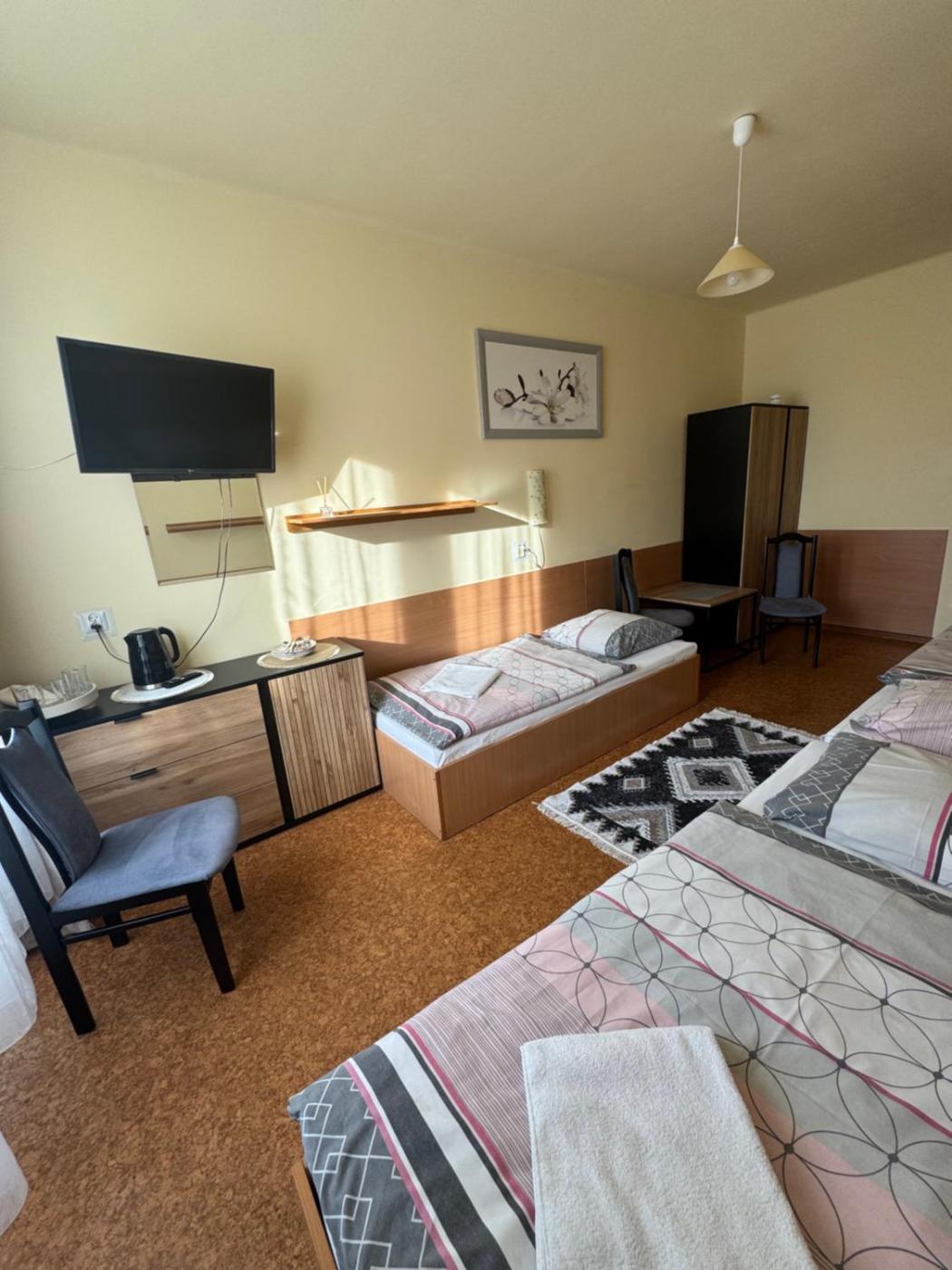 Pokój trzyosobowy. The triple room features a tea and coffee maker, a wardrobe, heating, a flat-screen TV, as well as a shared bathroom in the corridor. The unit has 3 beds. Pokój Trzyosobowy - 3 osobowy. Powierzchnia pokoju ok.: 12 mkw. ;